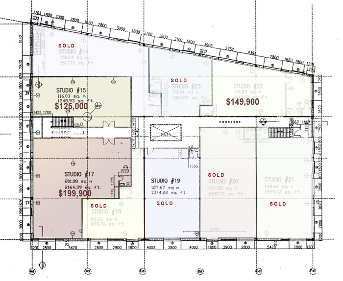 On the second floor the hall area and the center of the building has skylights on the top surfaces.